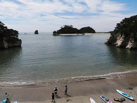 【外松島ツアーの流れ①】 現地解散の為、集合場所から各自の車で、おおよそ15分のポイントへ移動します。 前半、ビーチにて安全かつ楽しく基本動作やバランスの取り方など注意点についてレクチャー。 女性は勿論、大半の方がこの時点て立漕ぎが可能になります。 |