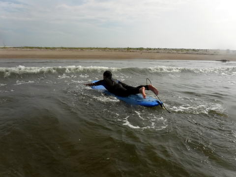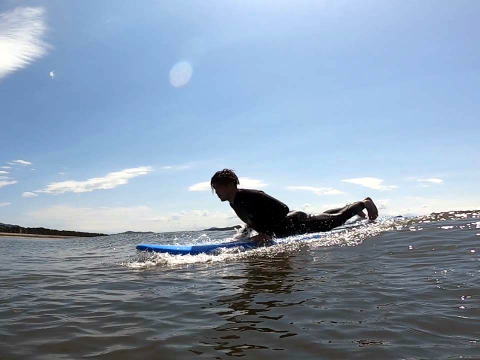 【体験サーフィンの流れ ②】 基礎的なパドリングより開始! 初めてサーフィンを体験する受講者が殆どの為、 出来る限りウネリの弱い場所にて行います。 泳ぎに自信の無い方でも安心してパドリングが出来るよう、 当日は足の届く範囲で行います。 (沖には行きません) ※その日のコンディションや、受講される方により多少内容が変わります |