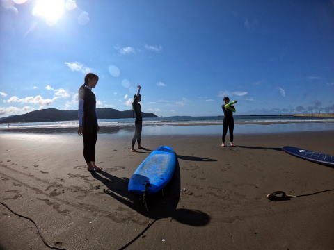 【体験サーフィンの流れ ④】 その後、またビーチにてレクチャーした後、いざテイクオフ! その日のコンディションや参加者にもよりますが、 レッスン開始から、一時間位で立てる方もいらっしゃいます。 こちらのスクールは「ボードの上に立って滑る」事がメインになる為、 スタッフのアシスト付での受講となります。 ※何度か経験が有り、立った事の無い方へ。 お客様のスキルにもよりますが、ご要望が有れば受講時間を【体験サーフィンの流れ③】をとばし 「立つ事を優先」で指導する事が可能です。 |